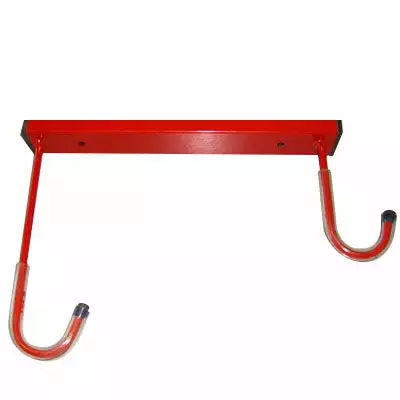 Cette fixation de vélo au plafond maintient deux vélos par la roue avant via deux crochets. Pour protéger la jante, ces crochets sont recouverts d’une protection en plastique. Pour éviter que les guidons ne se gênent, les deux crochets sont positionnés à des hauteurs de 14 et 25 cm.