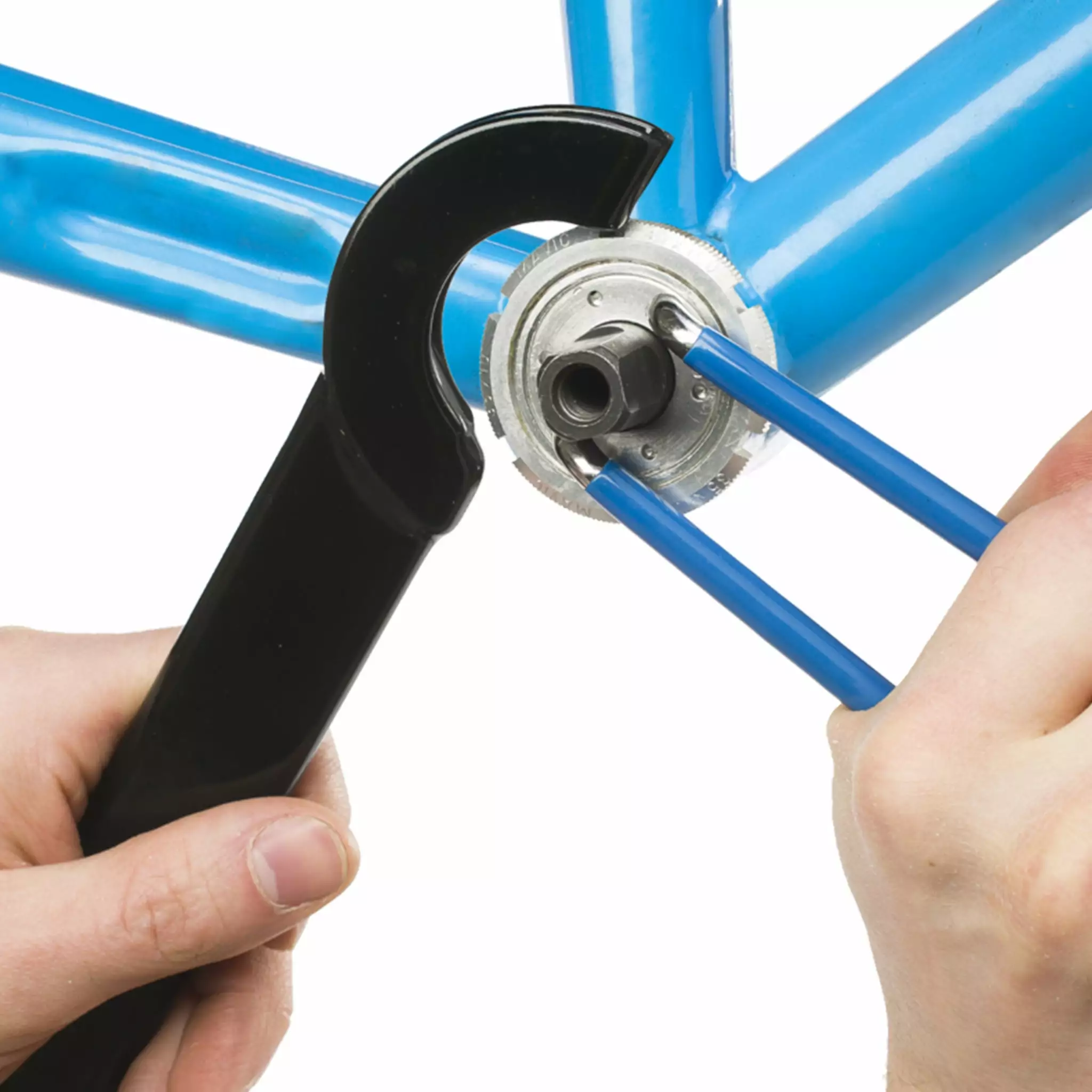 La clé demi lune Park Tool permet de desserrer et régler efficacement les contre écrous crantés des boitiers de pédalier d’ancienne génération sur de vieilles bicyclettes. Une fois la tête engagée dans l’ergot du contre-écrou, utilisez la pince pour cuvette Var pour desserrer le contre écrou.