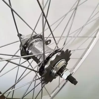 La jante 700 de la marque Mach1 CFX de couleur argent est semi profilée sans œillets et sa rigidité vous garantie un très bon rendement. La roue est équipée d’un moyeu Vélosteel rétropédalage et d’un pignon de 17 dents montée sur des rayons de type galva.