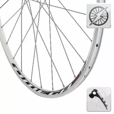 Pour ceux qui ne veulent plus consommer inutilement des piles pour leur éclairage de vélo, voici la solution idéale : dans cette roue avant avec axe à serrage rapide de 700 Omega de Mach1 ou 28 pouces, une dynamo de la marque SHIMANO produit une tension de 6V avec une puissance de 3W.