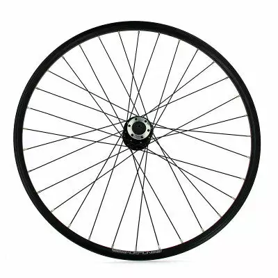 Cette roue avant est spécialement conçue pour être montée sur un vélo tout terrain de 26 pouces. Son moyeu est spécialement conçu pour y fixer un disque de frein. Pour installer votre disque de frein, 6 vis M5 de 10 mm vous sont proposées en option. Si besoin, des disques de frein sont disponibles. Tous les éléments de roue (jante, moyeu et rayons) sont noirs. Son moyeu est en aluminium et il est livré avec son axe à serrage rapide. L’entraxe mesure 100 mm. La roue montée pèse 1120 grammes.