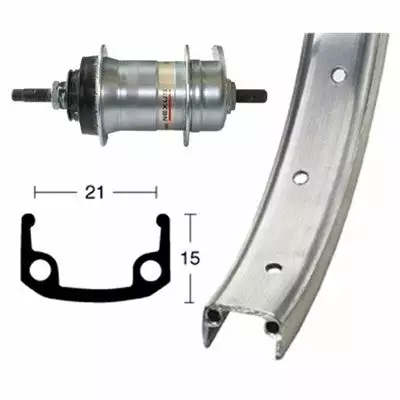 La roue arrière, de 21 mm de large et 559 mm de diamètre interne, est adaptée pour les vélos 26 pouces. Elle est équipée d’un moyeu à axe plein à écrous avec système à rétropédalage et un pignon 3 vitesses Shimano. La jante est dotée de 36 trous avec rayons zingués. Elle est conçue pour accueillir une valve schrader de 8,5 mm. La jante et le moyeu sont en aluminium couleur argent.